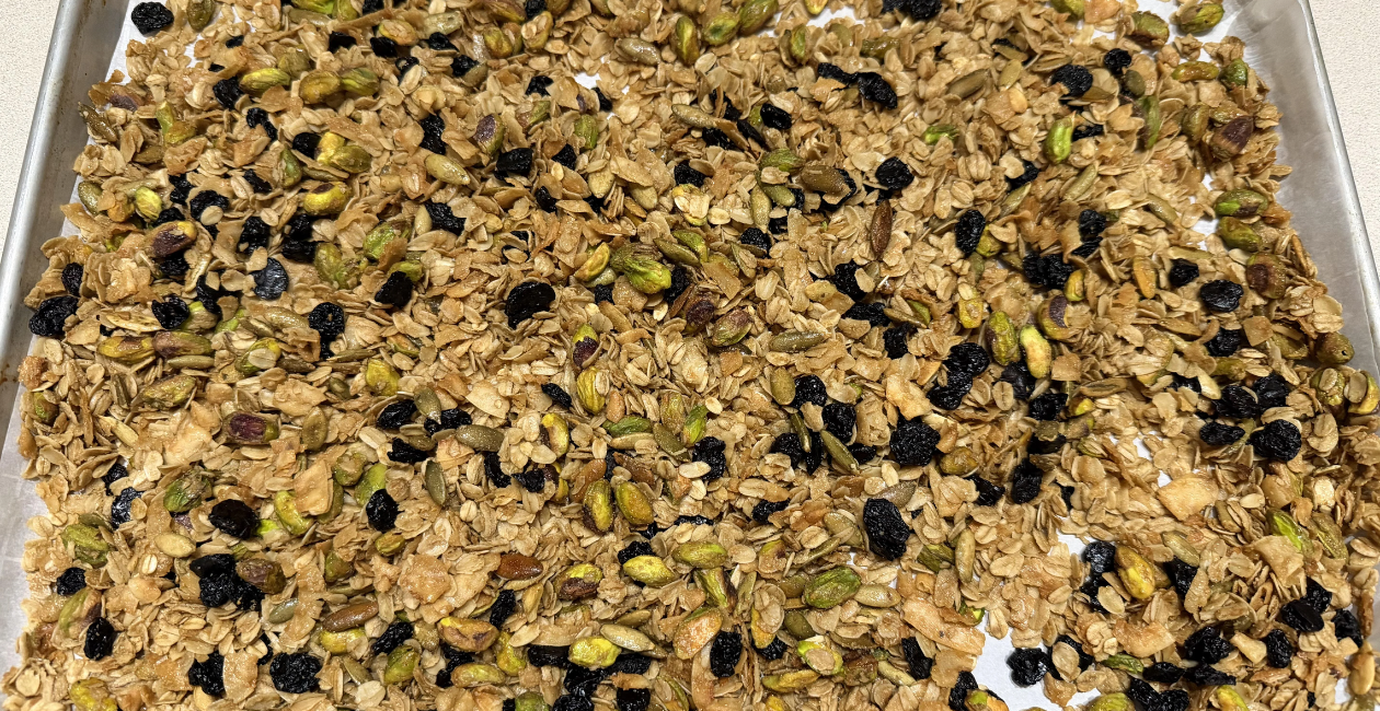 The granola does not rely on one star ingredient. It works because the mix is balanced. Rolled oats give it structure and that familiar toasted base. Pistachios bring a buttery, slightly savory depth that tastes more elegant than the usual almond-heavy granola. Pumpkin seeds add another layer of crunch and keep the flavor from leaning too soft or too sweet. Coconut chips bring toastiness and a light natural sweetness, which helps round out the whole thing.
